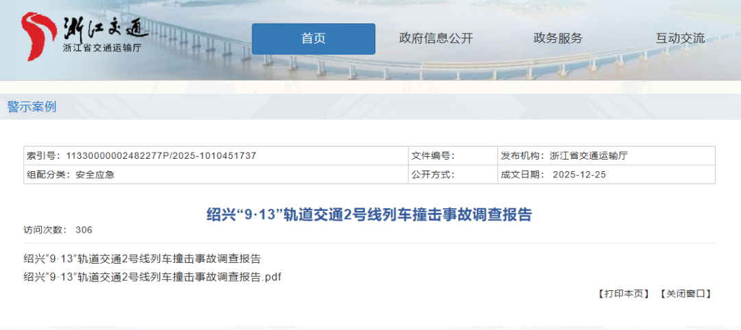记者12月25日从浙江省交通运输厅获悉,绍兴“9·13”轨道交通2号线列车撞击事故调查报告正式发布。2025年9月13日23时25分许,绍兴市轨道交通2号线一返场维修的空载列车,在檀渎站开往豆姜站下行区间与4名保洁人员发生碰撞。调查认定,绍兴市“9·13”轨道交通较大事故是一起因涉事企业安全风险辨识管控不到位、从业人员违反安全操作规程等导致3人死亡、1人重伤的生产安全责任事故。