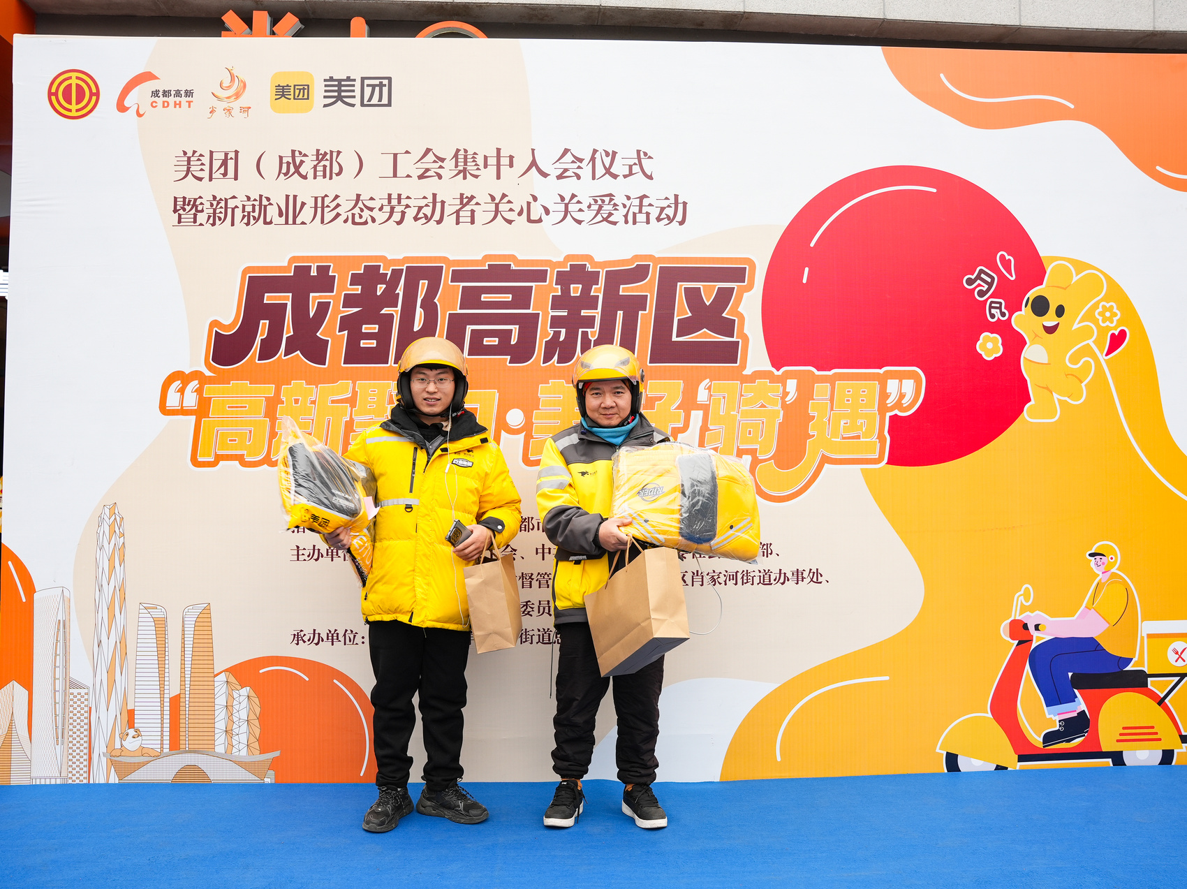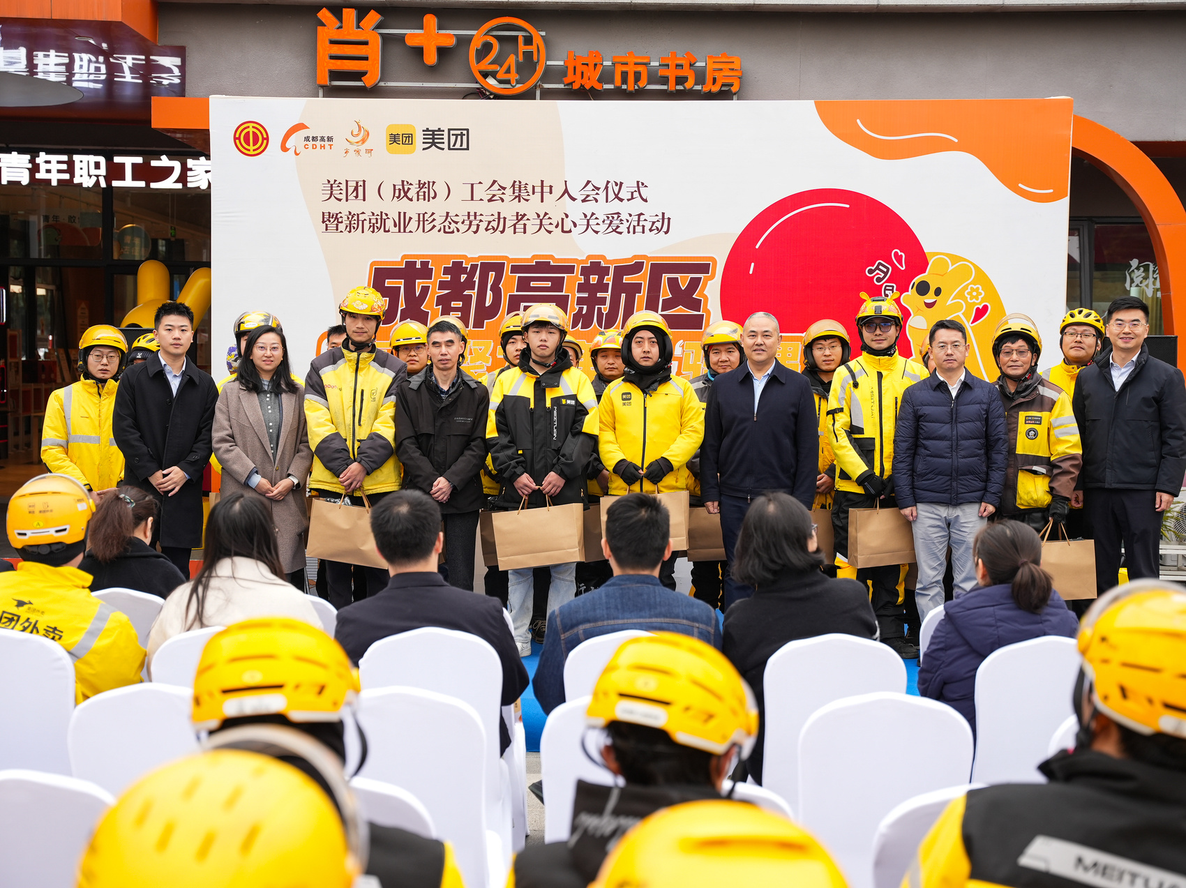 12月24日上午,成都高新区“高新聚力・美好‘骑’遇” 美团(成都)工会集中入会仪式暨新就业形态劳动者关心关爱活动在24H肖+青年职工之家温情启幕。
