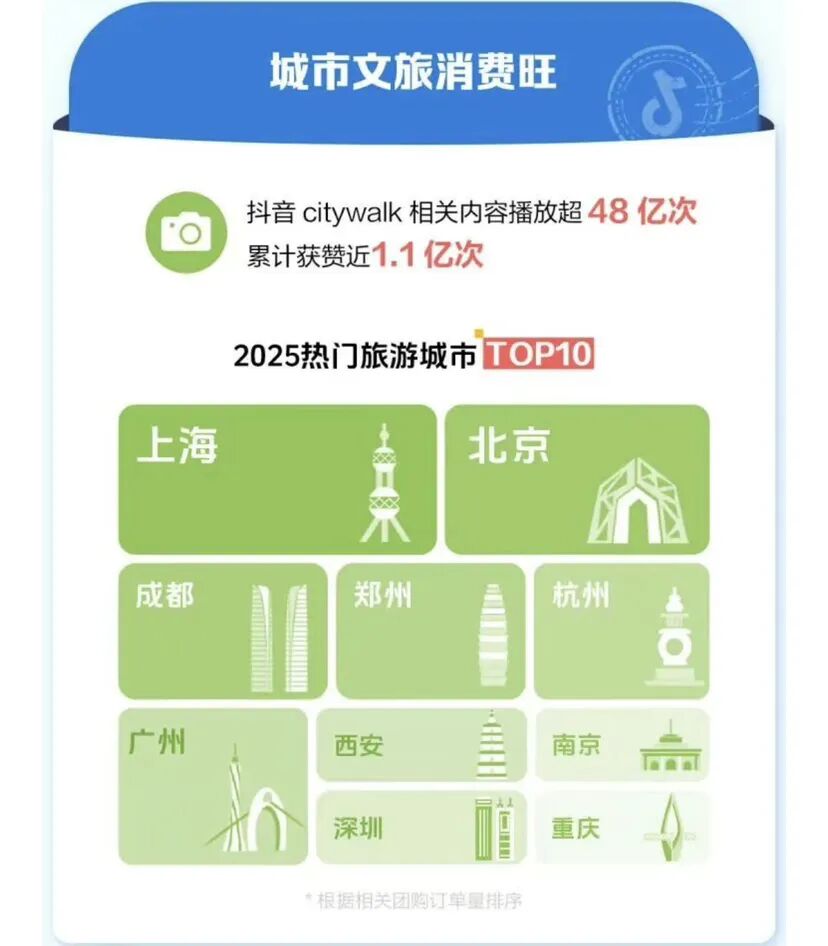 从订单消费看,上海、北京、成都、郑州、杭州、广州、西安、深圳、南京、重庆入围十大热门旅游城市。抖音景区团购订单量同比增长32%。“NPC游”“IP游”持续出圈,万岁山武侠城、河头老街·大唐百戏园、上海迪士尼度假区、北京环球度假区、郑州银基动物王国、上海海昌海洋公园、河南宝泉旅游区、清明上河园、南京牛首山文化旅游区、重庆动物园成为十大热门景点。