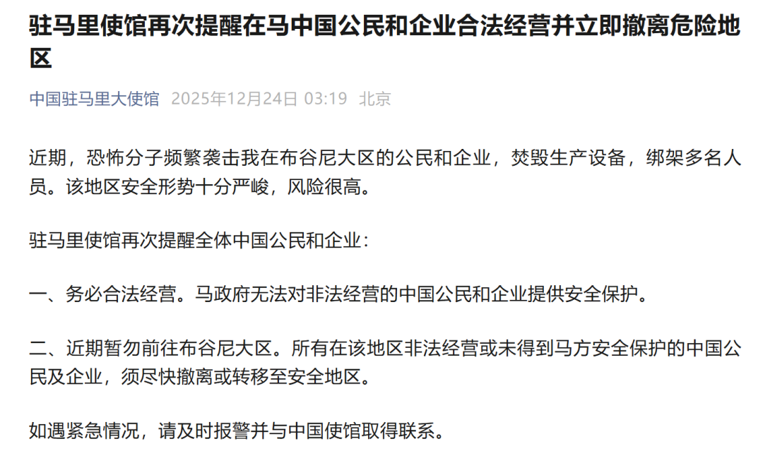 驻马里使馆再次提醒在马中国公民和企业合法经营并立即撤离危险地区 近期,恐怖分子频繁袭击我在布谷尼大区的公民和企业,焚毁生产设备,绑架多名人员。该地区安全形势十分严峻,风险很高。