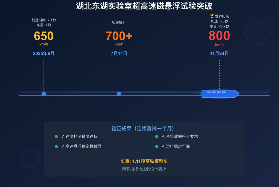 2025年6月,湖北东湖实验室成功实现将1吨级试验车在7.1秒内从静止加速至650km/h。