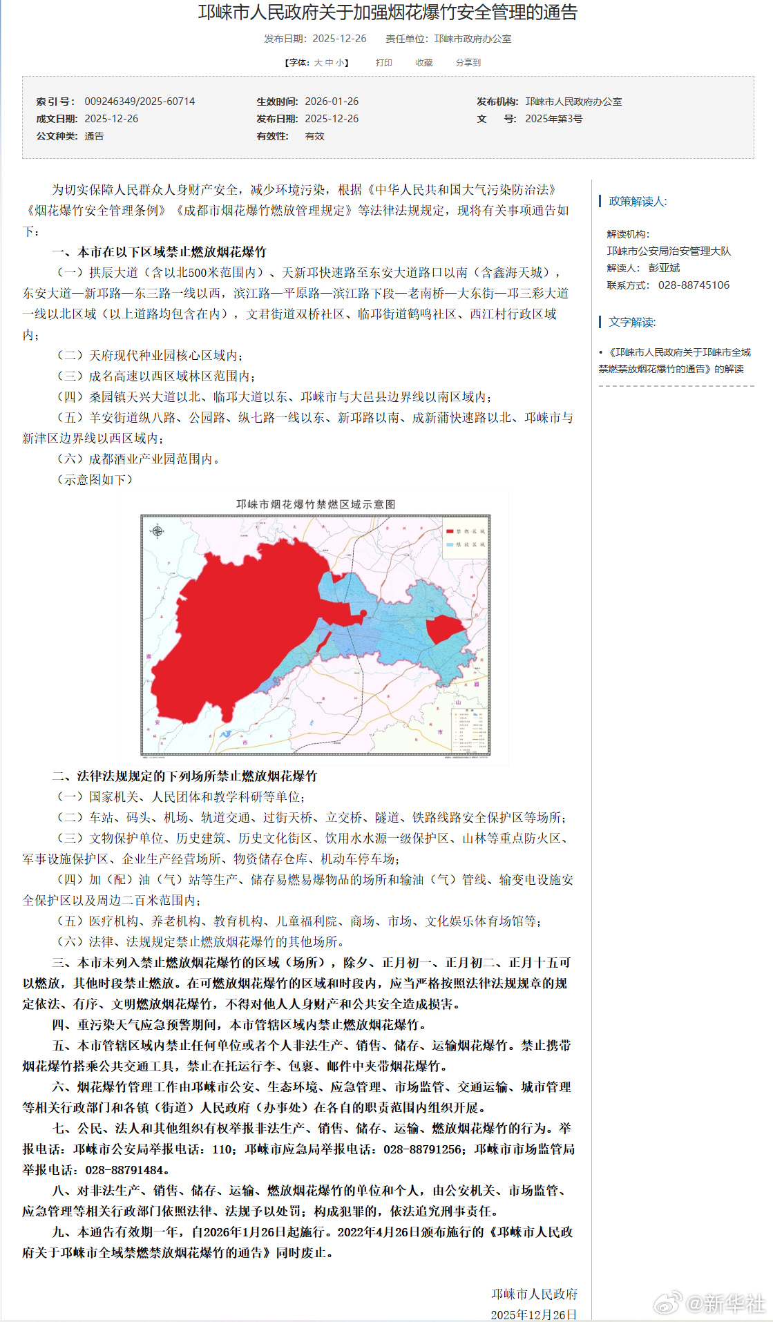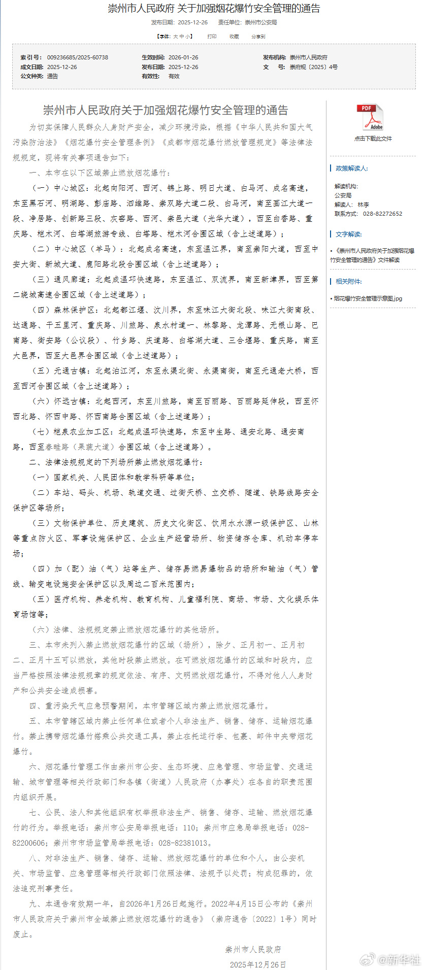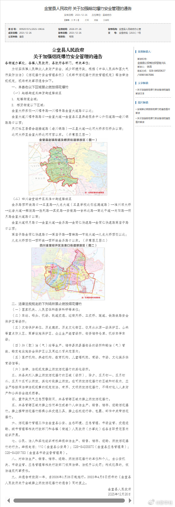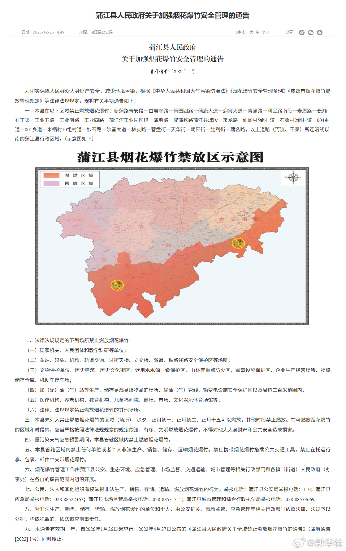 12月26日,成都8县市陆续发布烟花爆竹安全管理《通告》,对本区域的烟花爆竹燃放管理进行优化调整。《通告》显示,在成都8县市划定的限制燃放区域内,市民群众可在除夕、正月初一、正月初二、正月十五这四天燃放烟花爆竹。