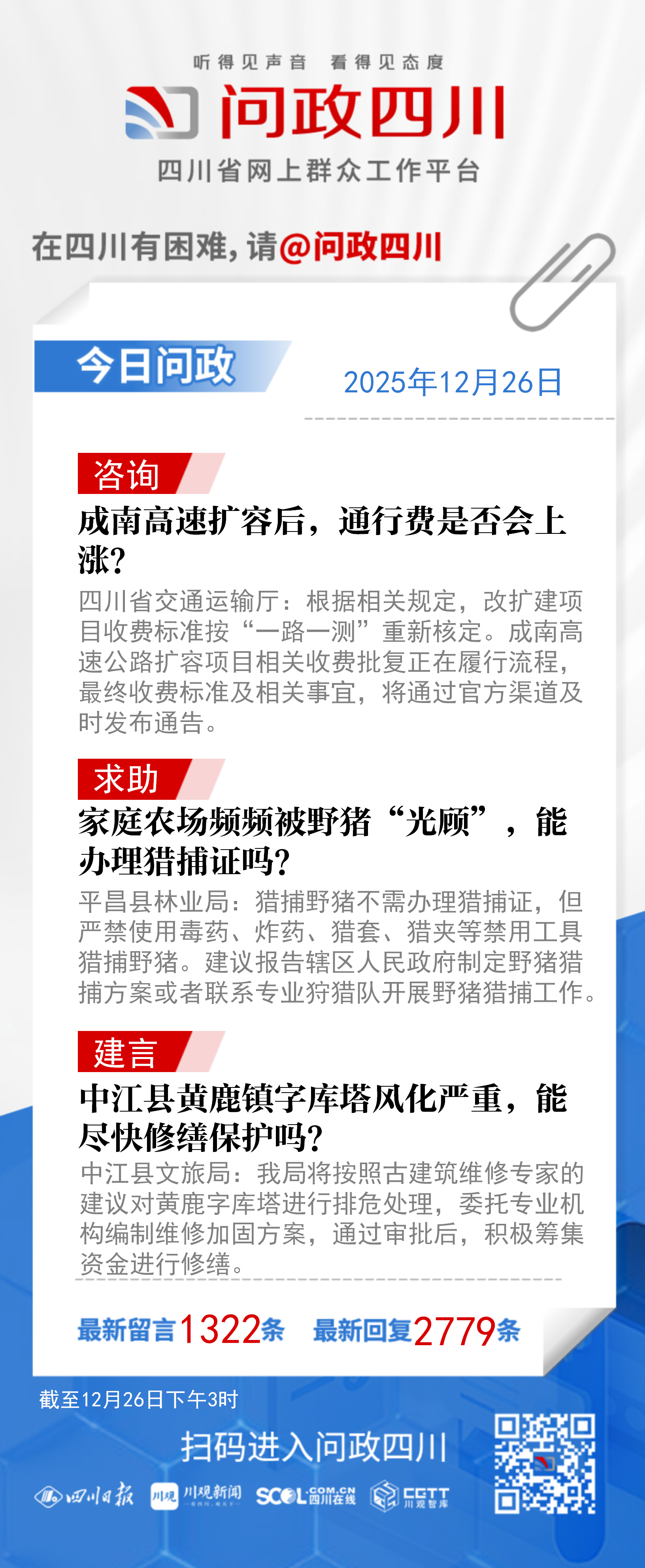 四川省交通运输厅回复:根据《收费公路管理条例》《四川省高速公路车辆通行费定价办法》相关规定,改扩建项目收费标准严格遵循法定程序和有关要求,并按“一路一测”重新进行核定。目前,成南高速公路扩容项目相关收费批复正在按规定履行流程,最终收费标准及相关事宜,将通过官方渠道及时发布通告,请您持续关注省交通运输厅及相关单位信息发布。下一步,我们将指导高速公路营运公司做好道路通行安全保障和出行服务,提升路网运行综合效率;做好道路保通保畅工作。