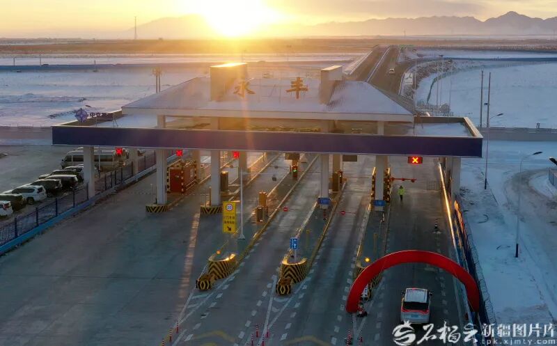 12月26日,无人机航拍的乌尉高速公路永丰匝道收费站。石榴云/新疆日报记者 韩亮摄