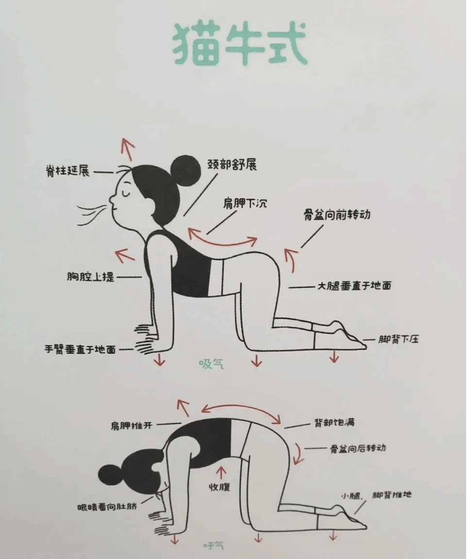 双手双膝轻轻撑地,吸气时缓缓塌腰、抬头,让下腹与骨盆底肌自然放松;呼气时拱背、低头,像猫伸懒腰一样把腰背拉长。