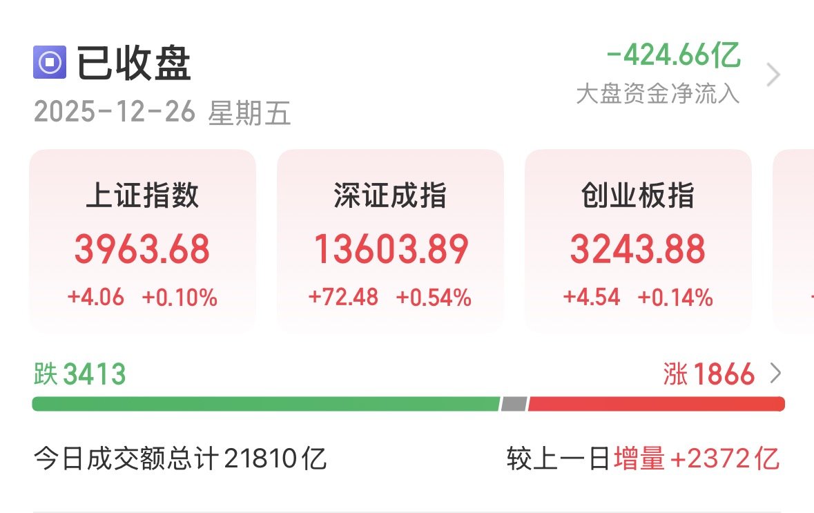 12月26日,A股三大指数在集体小幅上涨中,结束了本周的行情,沪指日线拉出八连阳。截至收盘,沪指涨0.10%,收报3963.68点;深证成指涨0.54%,收报13603.89点;创业板指涨0.14%,收报3243.88点。全市场全天成交额达到2.18万亿,较昨日大幅放量2372亿。指数上涨的同时,个股却打了“退堂鼓”,超3400只个股下跌,“亏钱效应”显著。