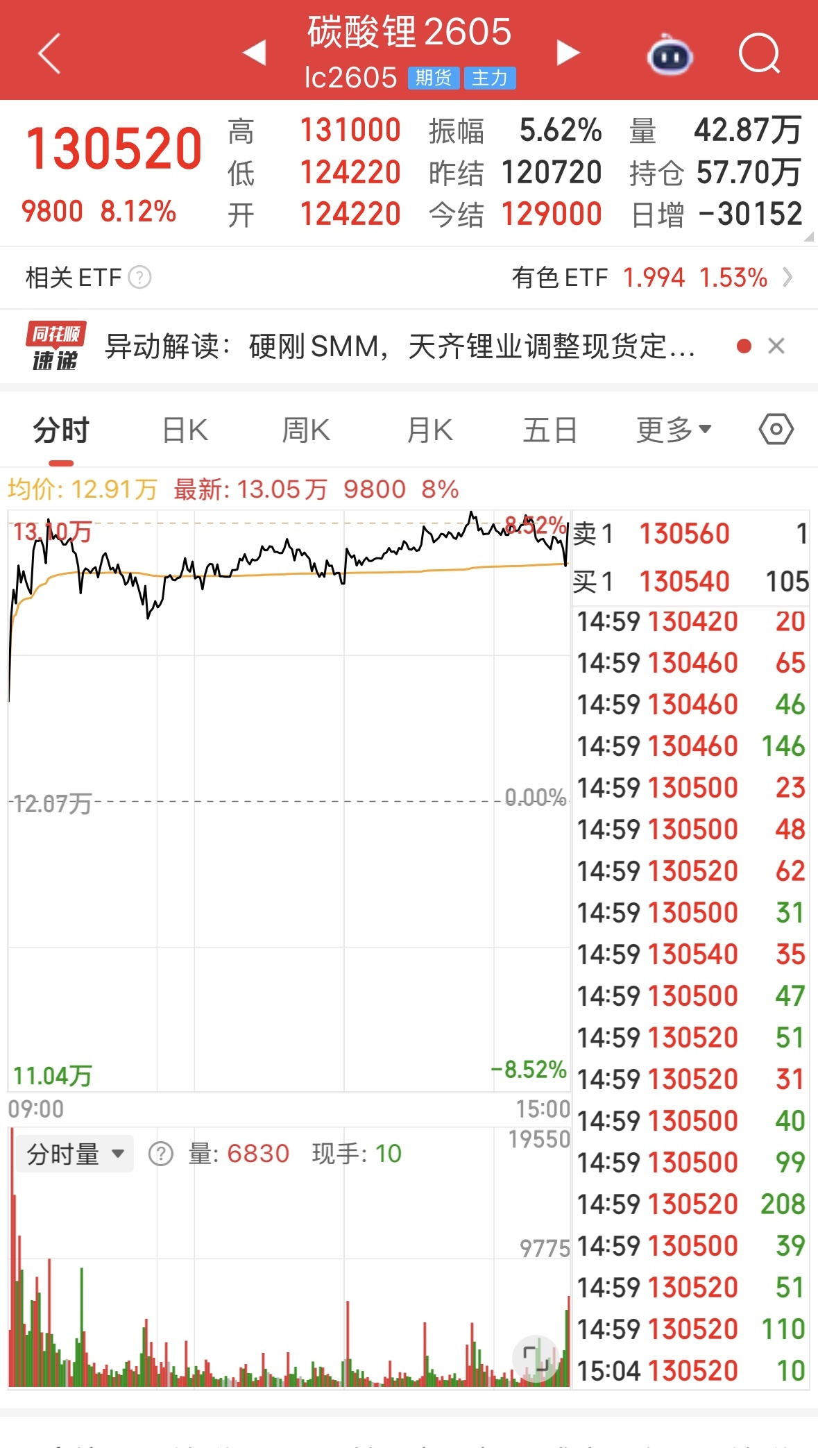 板块涨跌互现。其中,锂电池板块大涨,丰元股份、天际股份涨停,华盛锂电涨超11%,湖南裕能、龙蟠科技、金圆股份等跟涨;碳酸锂主力合约强势突破13万关口,日内涨超8%,创2023年11月以来新高。