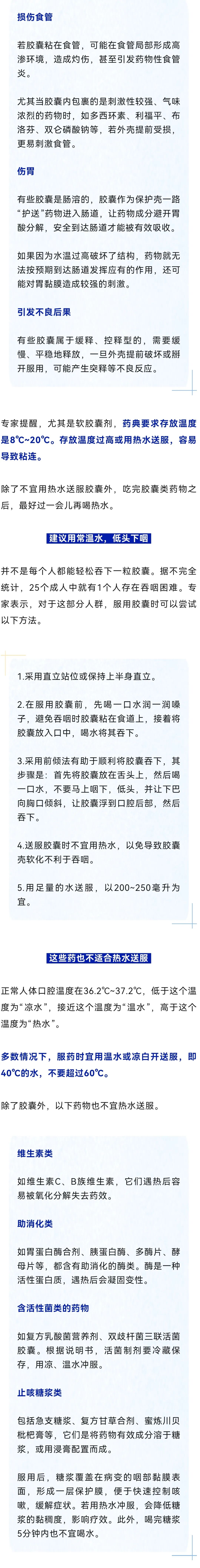胶囊长时间和食管接触、在错误位置溶解、药物提前释放,可能会带来以下健康风险。