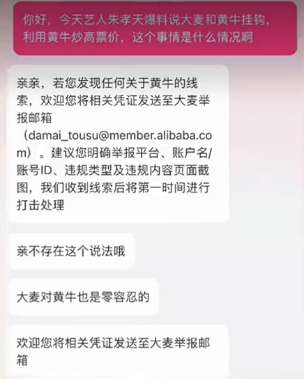 此外,12月25日,记者向爆料里提到的大麦了解相关情况,客服回应否认这个说法,称对黄牛零容忍,票价均由主办方根据市场规则制定,大麦作为票务平台严格执行相关规定,不存在与第三方合作抬价的行为。(此前报道:大麦回应“朱孝天爆料五月天公司涉嫌勾结黄牛炒票”)