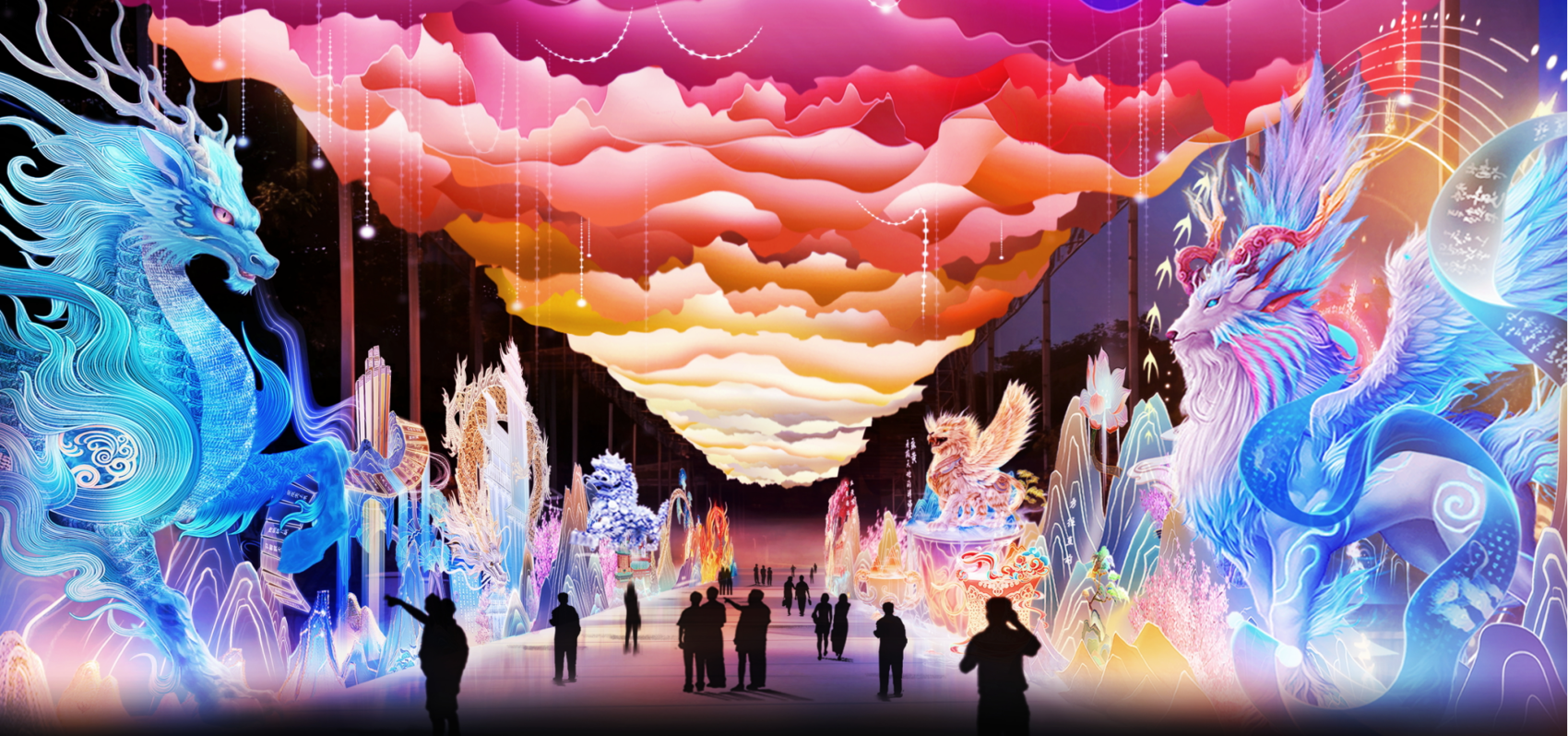 高35米、以中国结为创意的“华结映门”灯组,首次实现正背面视觉统一,宛如连接古今的时空之门;萃取《庄子》鲲鹏宏大意象的巨型灯组“神奇华夏”,长约210米,通过神话叙事,展现强国风貌与民族豪情;高22米的“年年招财”年兽灯组,搭载最新AI交互系统,实现远古瑞兽与人类的亲切“对话”;在农历马年来临之际,以《木兰从军》为蓝本打造的180米长“木兰传奇”灯组,让姿态各异的骏马造型与木兰的飒爽英姿相得益彰,传递出深沉的家国情怀。