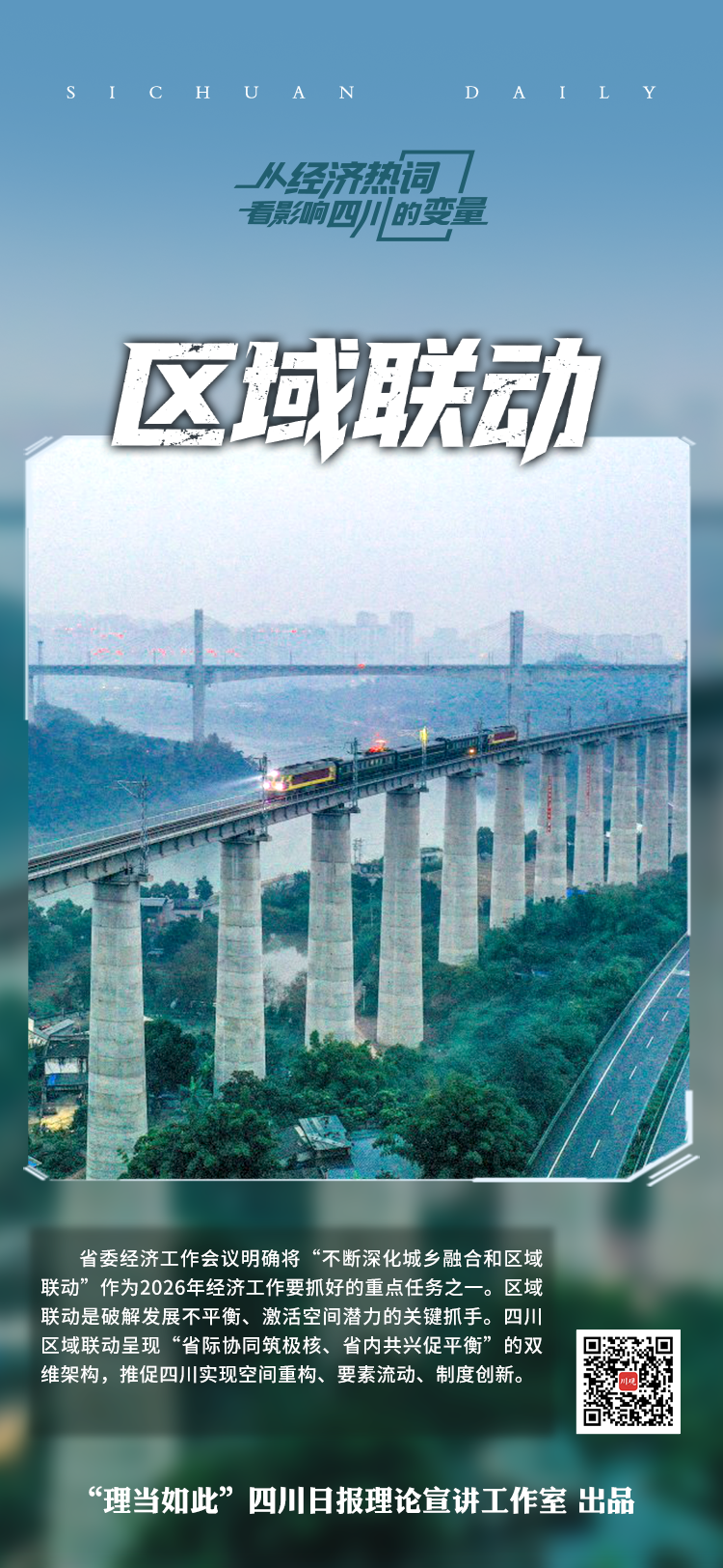 省委经济工作会议明确提出要“持续用力推进协调发展”,并将“不断深化城乡融合和区域联动”作为2026年经济工作要抓好的重点任务之一。区域联动是破解发展不平衡、激活空间潜力的关键抓手。四川区域联动呈现“省际协同筑极核、省内共兴促平衡”的双维架构,推促四川实现空间重构、要素流动、制度创新。省际层面深化与重庆全方位合作,提升成渝地区双城经济圈发展能级;省内层面践行“极核引领、次级支撑、竞相发展、片区协同”思路,推动“五区共兴”均衡发展,全域协调。