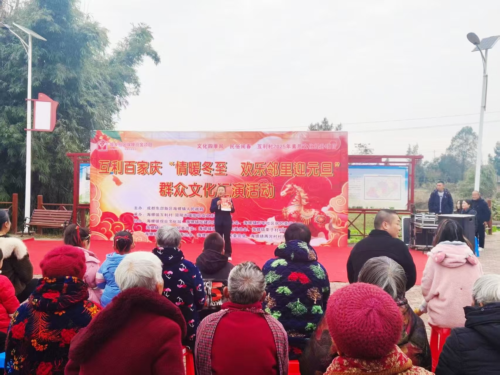 12月21日,成都东部新区海螺镇互利村举办“情暖冬至 欢乐邻里迎元旦”群众文化汇演活动。本次活动不仅为村民带来了一场精彩纷呈的文艺演出,还携手成都农商银行乡村振兴金融助理,开展了一场贴近生活的金融知识宣讲,实现文化惠民与金融服务“双下乡”。