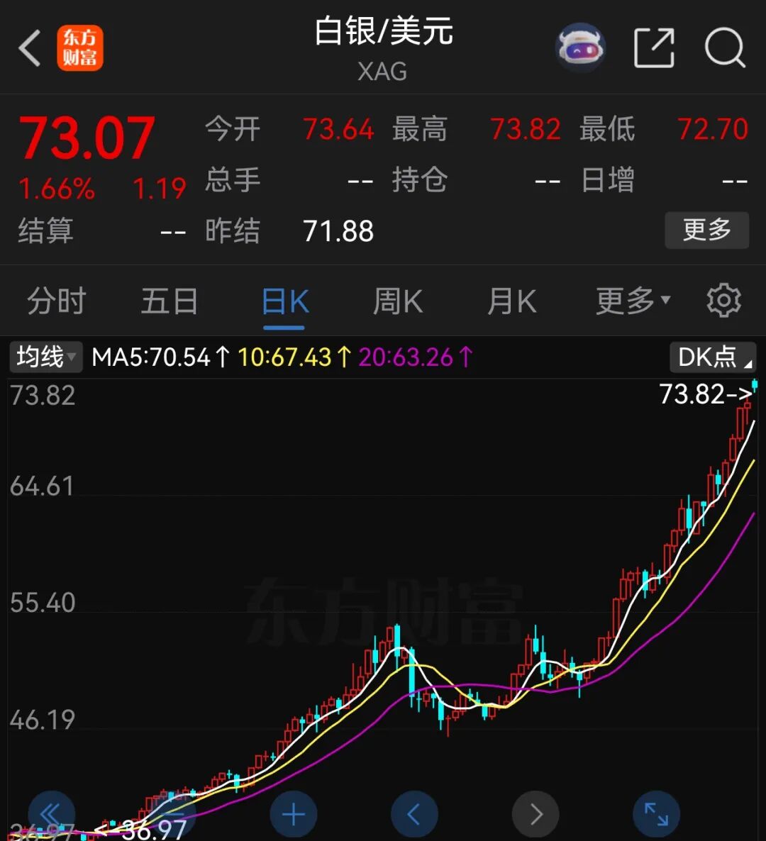 现货白银跳空高开,突破73美元/盎司,再创历史新高。