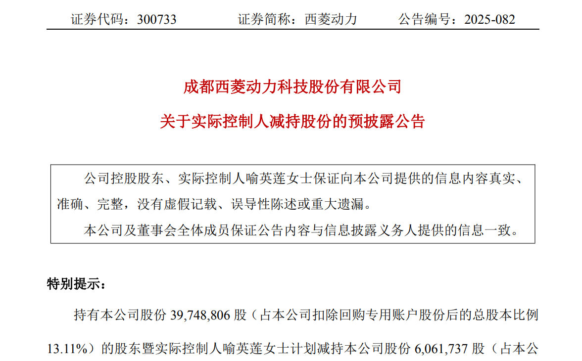 12月25日晚间,成都西菱动力科技股份有限公司(证券简称“西菱动力”)发布公告称,公司实际控制人之一喻英莲计划以大宗交易方式,减持公司股份606.17万股,占本公司扣除回购专用账户股份后的总股本比例2%。减持原因为个人资金需要,股份来源为首次公开发行前已发行及资本公积转增取得的股份。减持将于公告之日起15个交易日后的3个月内进行,减持的价格区间根据实施时的二级市场价格确定。