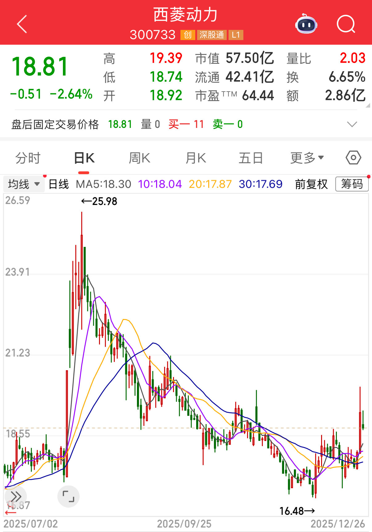 二级市场方面,12月26日,西菱动力收跌2.64%,报18.81元/股,总市值57.50亿元。
