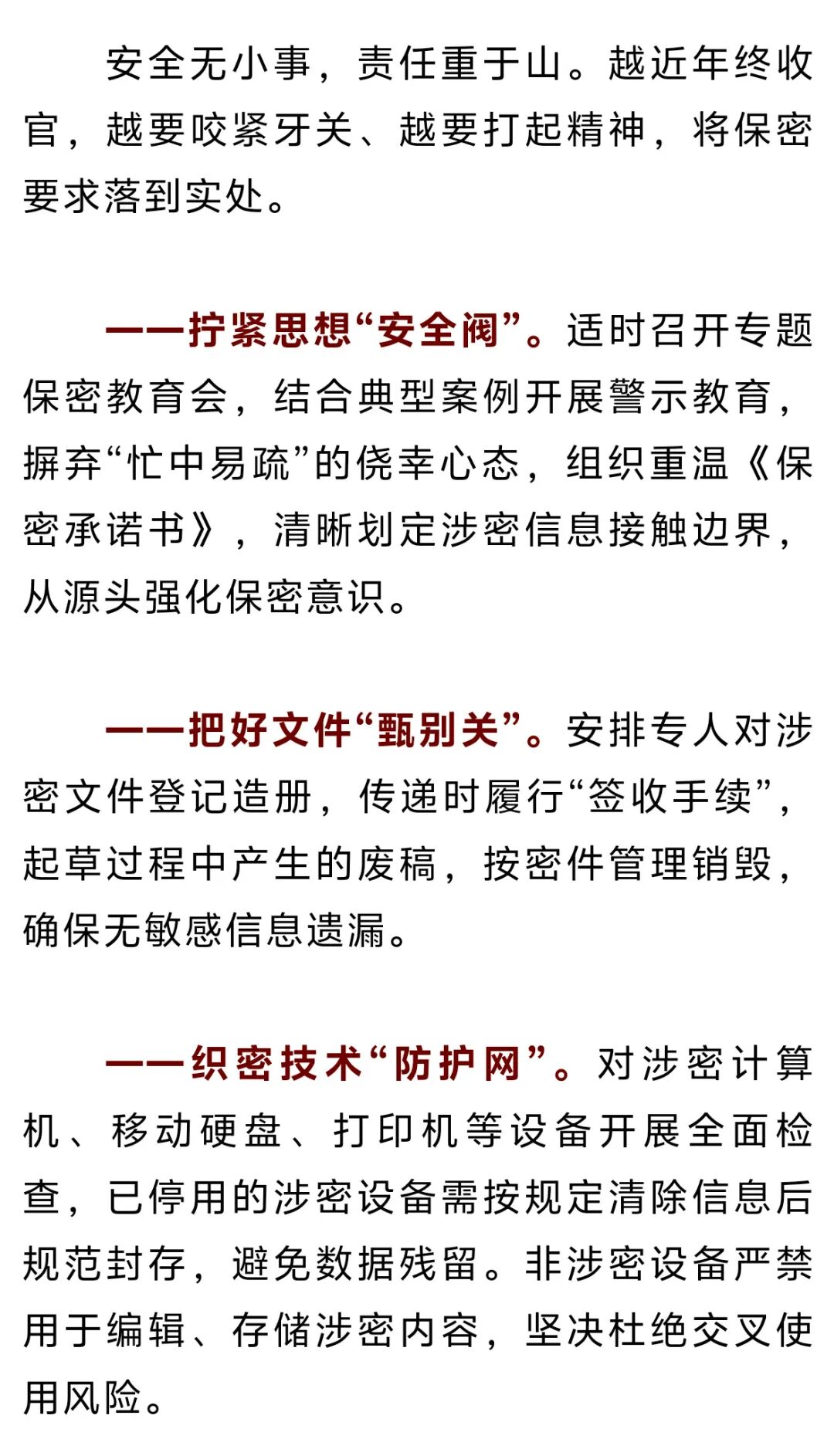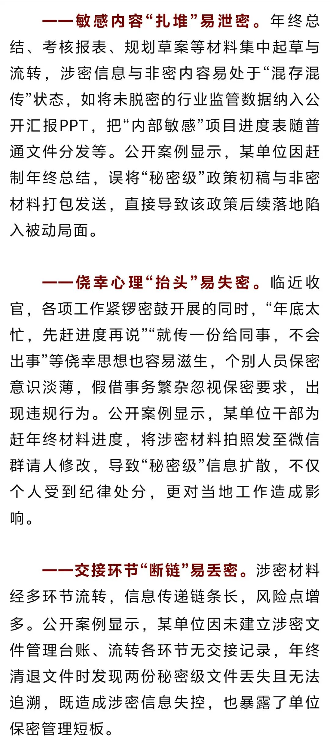 岁末年终,总结、考核、检查等工作密集开展。各类材料的整理、数据的汇总与后续计划的制定,往往涉及多方面的工作内容与内部信息。这些信息既是年度工作成果的体现,也与后续工作的衔接安排密切相关,一旦发生失泄密事件,不仅会打乱工作节奏,影响相关领域工作推进,还可能危害国家安全。