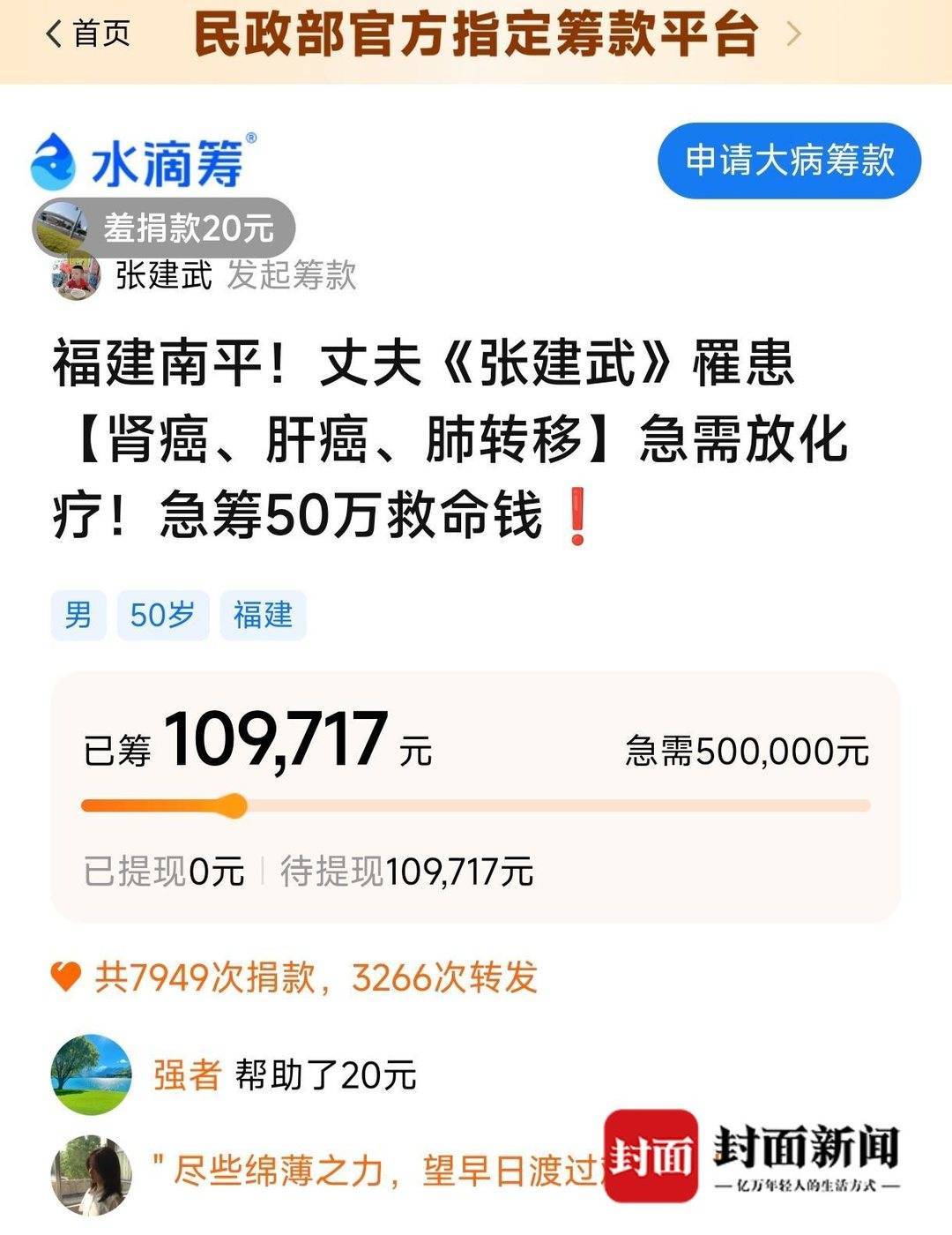 目前水滴筹平台已筹集10万元善款。