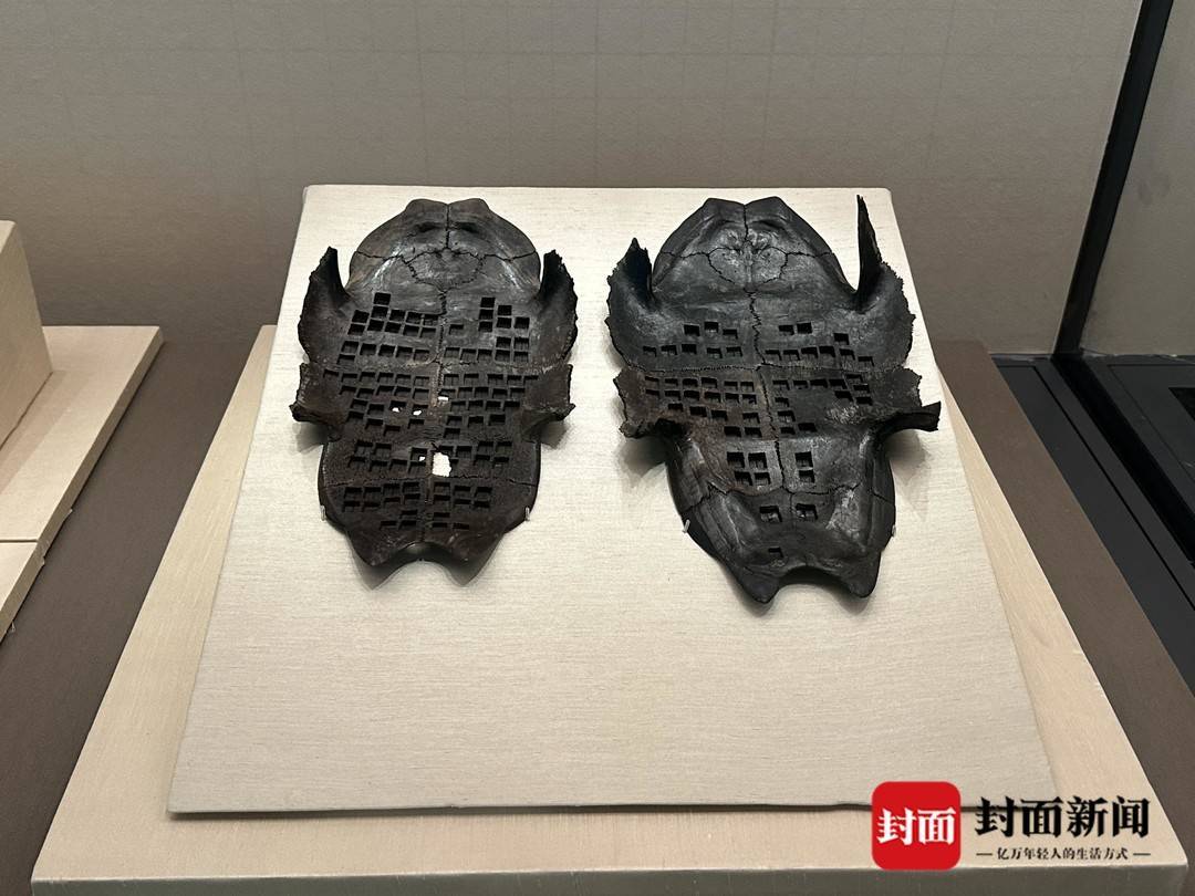 此次展出中还有多件特殊的“黑甲”,它们通体黝黑,形制罕见,是楚王珍藏——“长霝(灵)”。这些甲骨的出土地点是武王墩一号墓南边的椁室,根据椁室上的墨书文字,南边为“楚王府库”,也就是楚王的珍藏。