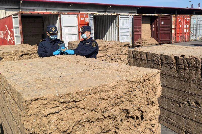 青岛海关2025年9月披露:查获一批禁止进境“洋垃圾”,共计746.78吨。该批进口货物申报品名为“再生纸浆(块状)”。图片来源:青岛海关