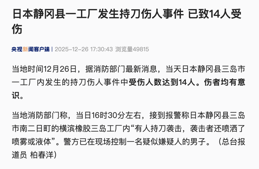 当地时间12月26日,据消防部门最新消息,当天日本静冈县三岛市一工厂内发生的持刀伤人事件中受伤人数达到14人。伤者均有意识。