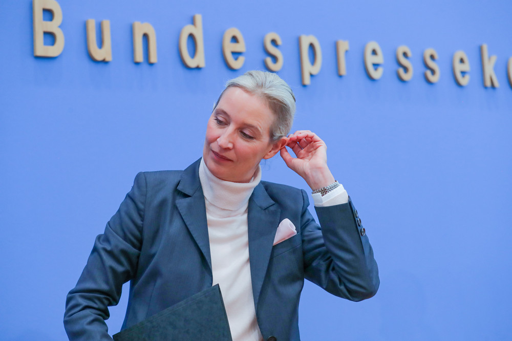 2月24日,在德国柏林,德国选择党领导人魏德尔出席新闻发布会。图据新华社