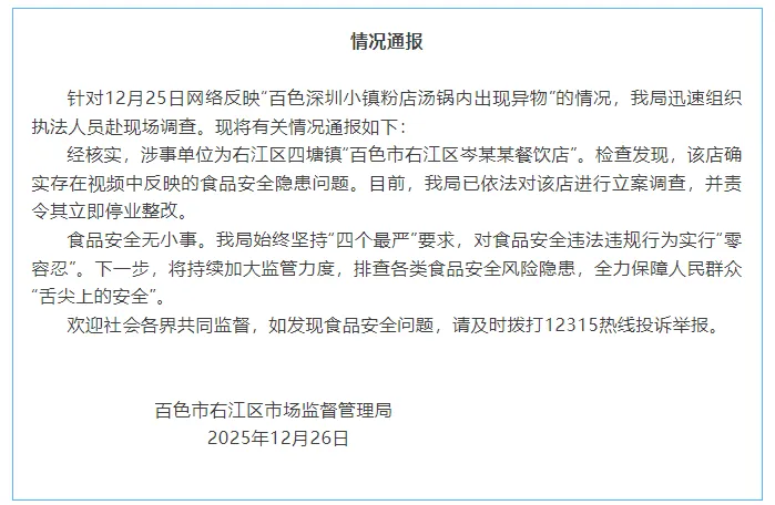 针对12月25日网络反映“百色深圳小镇粉店汤锅内出现异物”的情况,广西百色市右江区市场监督管理局迅速组织执法人员赴现场调查。该局于12月26日下午通报如下: