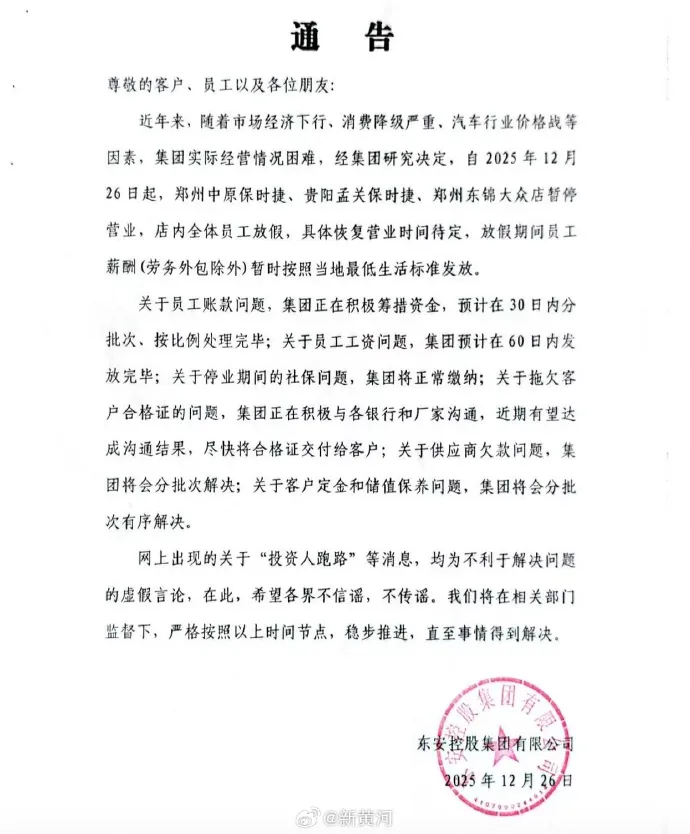 今天,东安控股集团有限公司(下称“东安集团”)打破沉默,发布《通告》正式确认:即日起,郑州中原保时捷、贵阳孟关保时捷、郑州东锦大众店三家门店暂停营业。