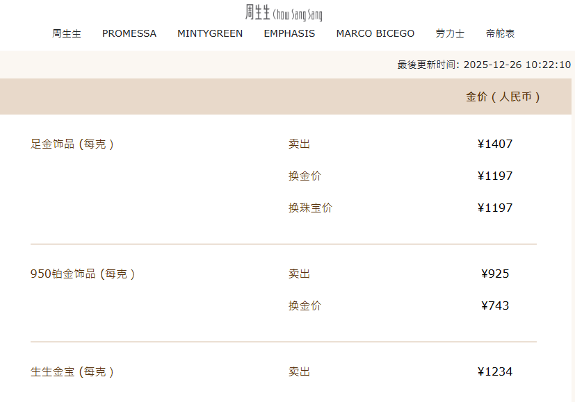 国内品牌部分品牌足金饰品跟涨。周生生足金饰品标价1407元/克,较前一日1397元/克的价格上涨10元/克。 老凤祥足金饰品标价1413元/克,较前一日1398元/克的价格上涨15元/克。
