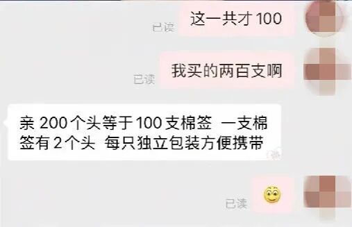 购买200支棉签到手只有100支客服给的理由是一根棉签有两头所以发100根没毛病