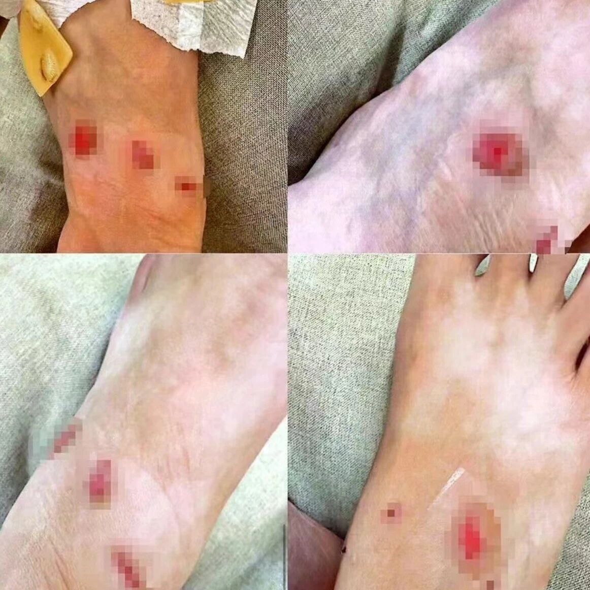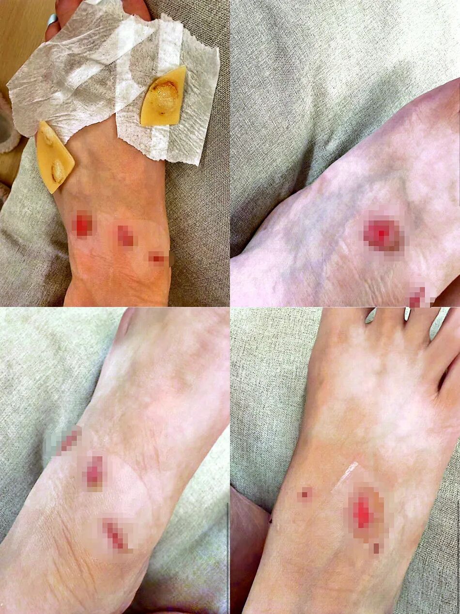 徐女士说,自己脚背上的伤口自从磨破后,便一直难以愈合。据徐女士提供的照片显示,她的双脚脚背出现多处破皮,呈鲜红色未能结痂,最大的伤口直径超一厘米。10月22日至12月24日,徐女士多次前往中山医院、上海交通大学医学院附属第九人民医院治疗,被告知需通过整形手术处理疤痕,据徐女士提供的诊断书显示,其“双足多处表浅瘢痕,伴色沉”诊疗计划为光电治疗,2-3个月一次,5-10次/疗程。