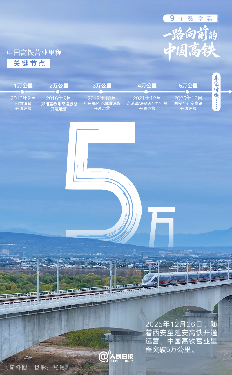 12月26日10点,随着C9309次“复兴号”智能动车组驶出延安站,西安至延安高铁开通运营,革命老区延安迈入“高铁时代”。至此,中国高铁运营里程突破5万公里,高铁发展再上新台阶。