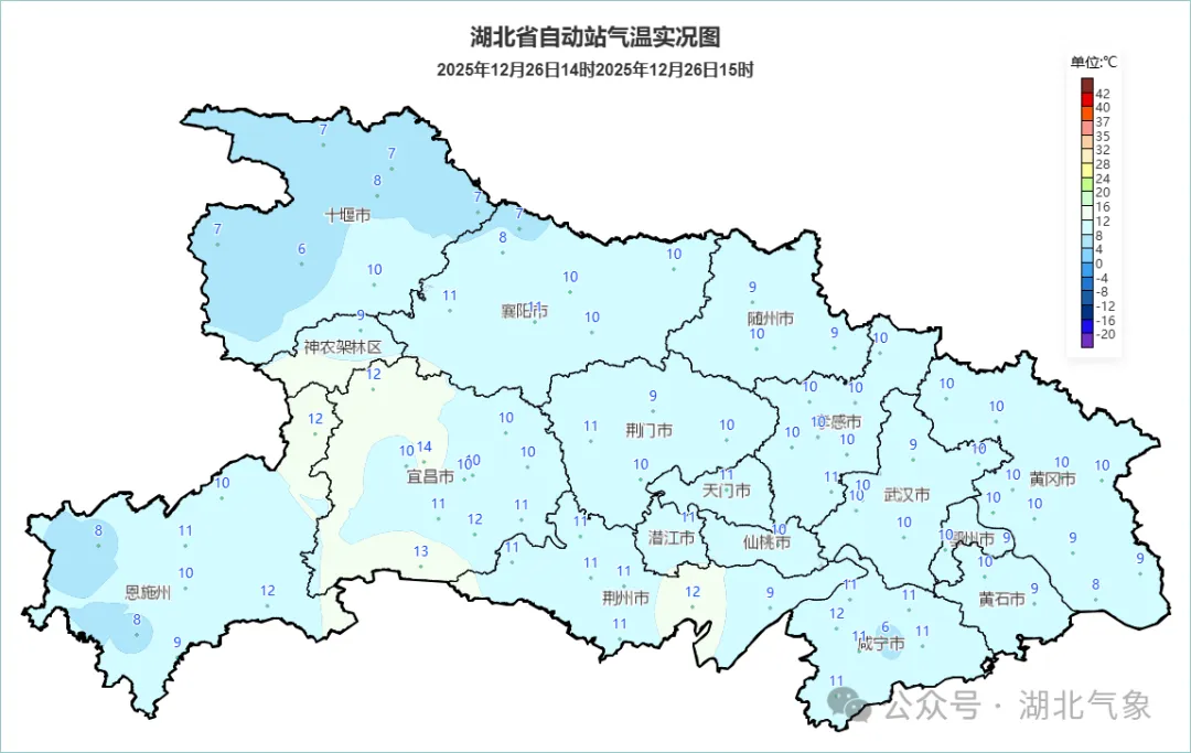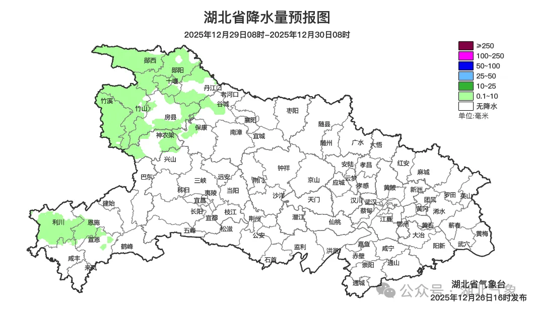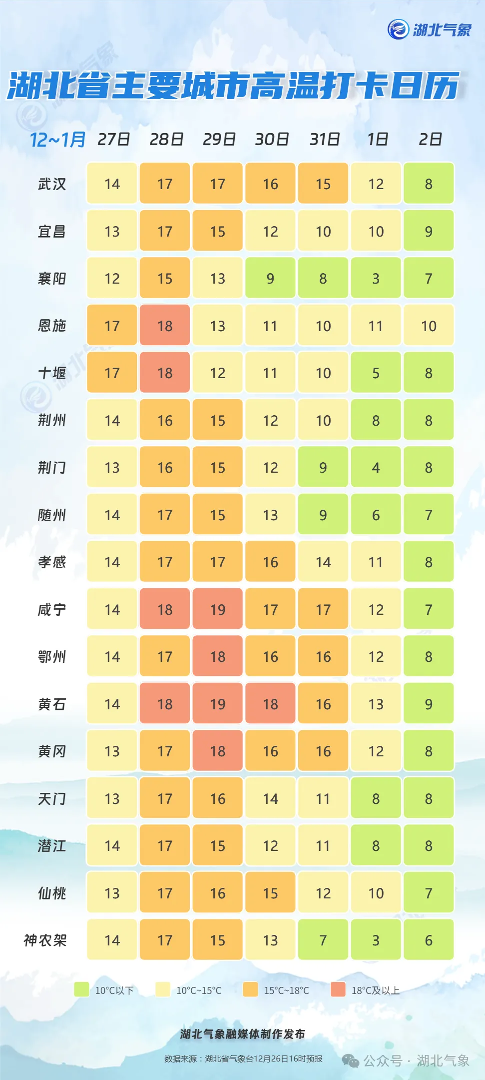 12月29日08时-30日08时,鄂西北、鄂西南多云到阴天有短时小雨;其他地区晴天到多云。最高气温中西部11~17℃、东部17~20℃,最低气温2~6℃,偏北风2到3级、阵风4到5级。