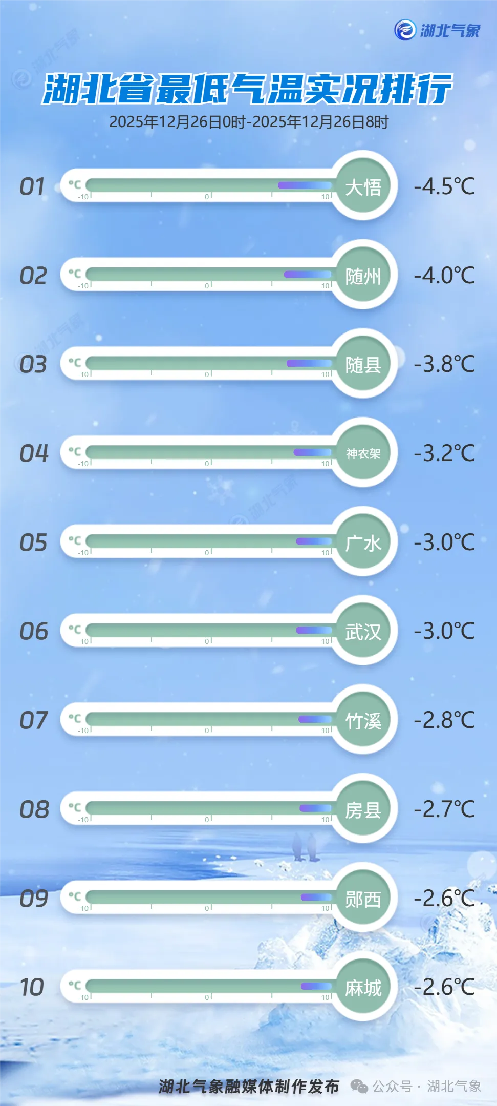12月26日20时-27日08时,全省晴天间多云。最低气温北部-4~-1℃、南部-1~2℃,偏东风2到3级。
