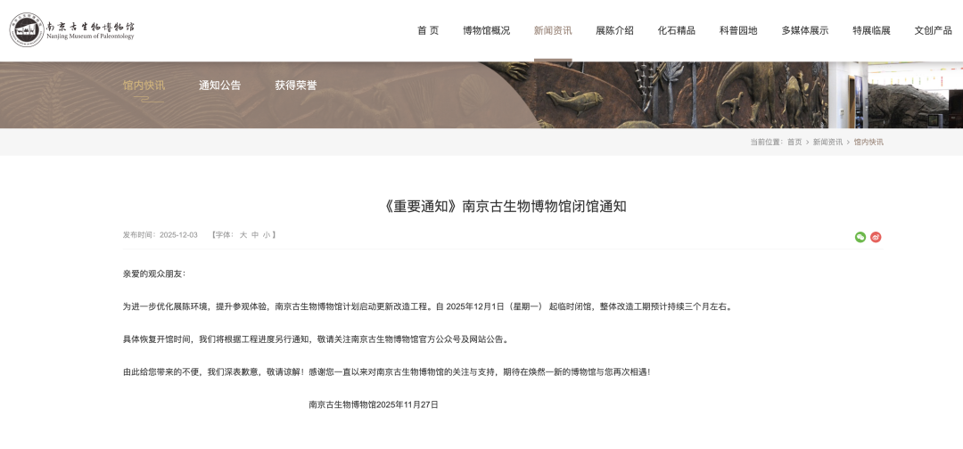 元旦期间不对外开放的,还有南京古生物博物馆。其官微发布通知称,为进一步优化展陈环境,提升参观体验,南京古生物博物馆计划启动更新改造工程,自2025年12月1日起临时闭馆,整体改造工期预计持续三个月左右。26日,该博物馆工作人员称,如公告所示,目前正在装修,元旦期间不能对外开放。