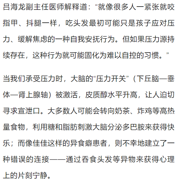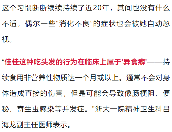 “我实在想不起来什么时候开始第一次吃头发,就是逐渐养成了习惯,心情不好、无聊了就会不自觉开始吃。”佳佳说,即便成年后,她清楚地了解到这样的行为并不合适,却无法控制,有时愣着神发呆就开始吃。
