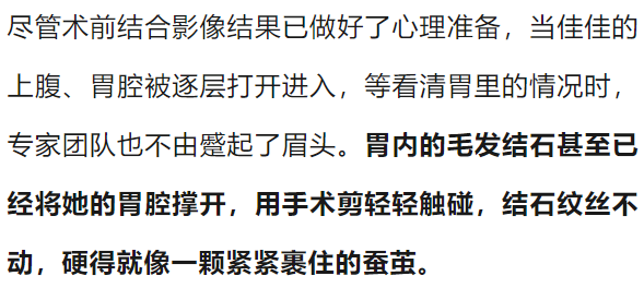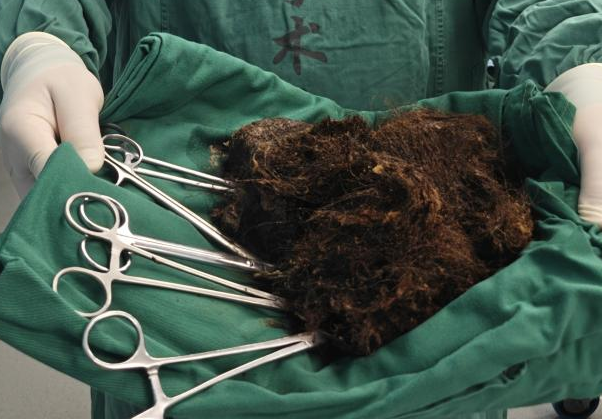 成团的异物包块表面全是密密麻麻的头发,由于头发无法被胃液消化、也很难把它们排出去,在胃酸的作用下,头发与食物残渣及其他胃内容物混合,像滚雪球似的越变越大、越变越硬逐渐形成坚硬的“胃石”,在临床上称为“毛石症”。