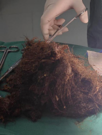 在胃肠外科于吉人教授的带领下,张卿副主任医师与石潇潇主治医师花了一个多小时将“蚕茧”分解后取出。从佳佳胃腔中取出的头发有整整近2斤!术中出血仅5ml,目前佳佳恢复良好,现已出院。
