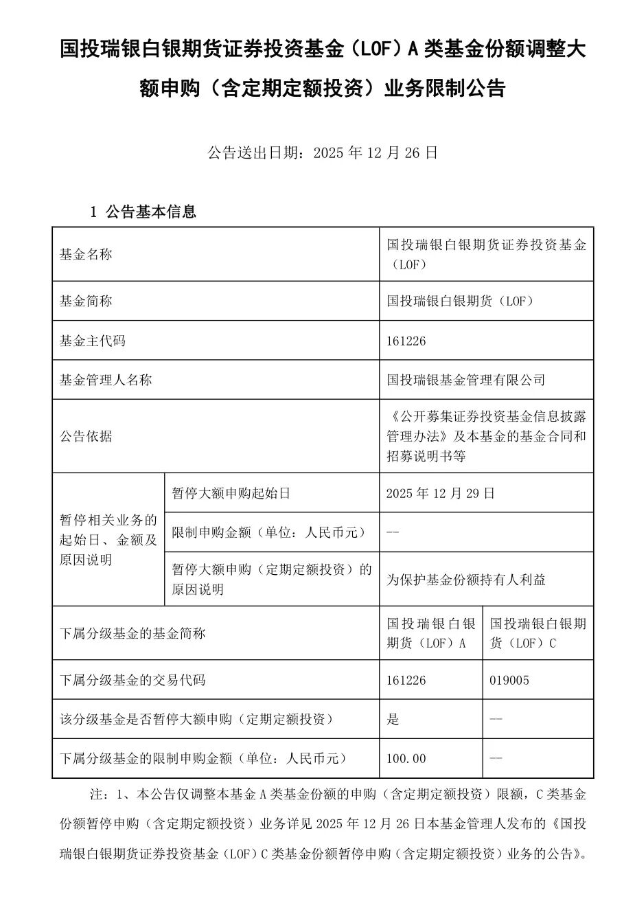 此后,国投瑞银白银期货(LOF)25日还发布公告称,12月29日起,限制本基金A类基金份额定期定额投资金额为100.00元。