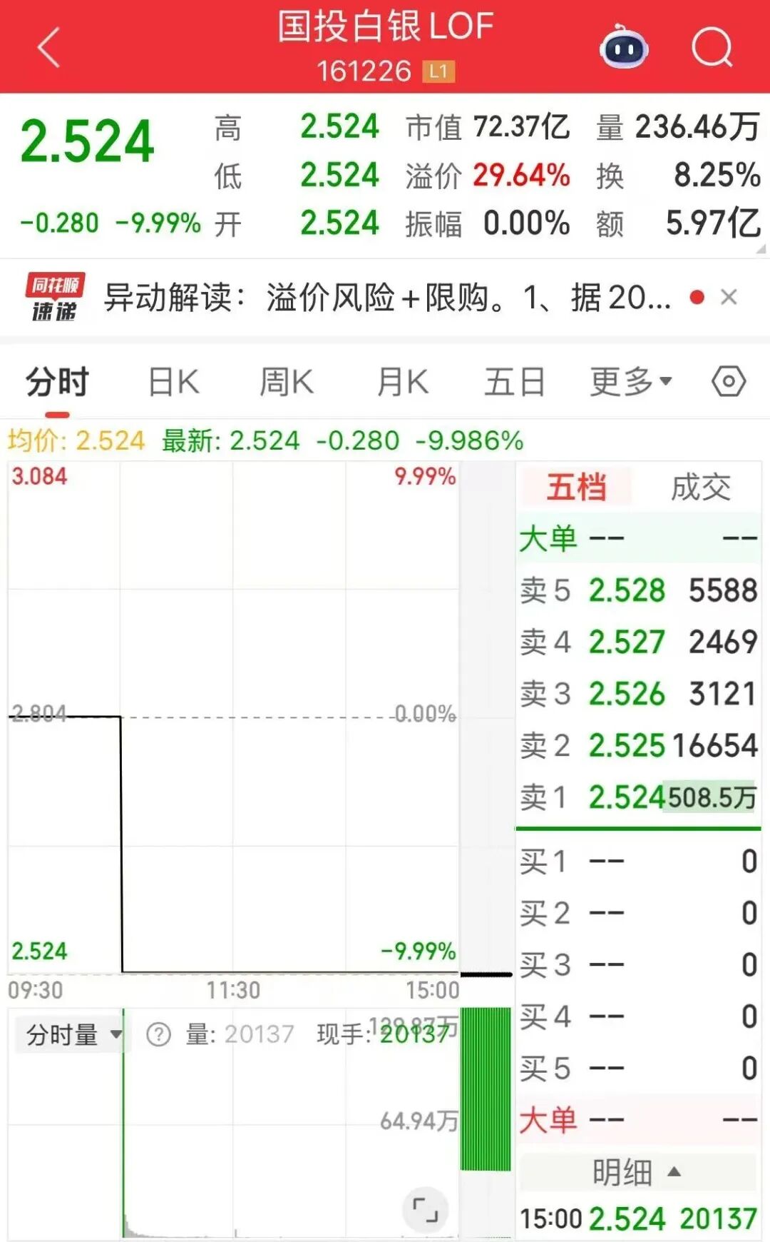今天10:30,国投白银LOF(161226)如期复牌、迅速跌停,已连续2日跌停。截至今天14点,成交额5.54亿元,现溢价率为29.64%。