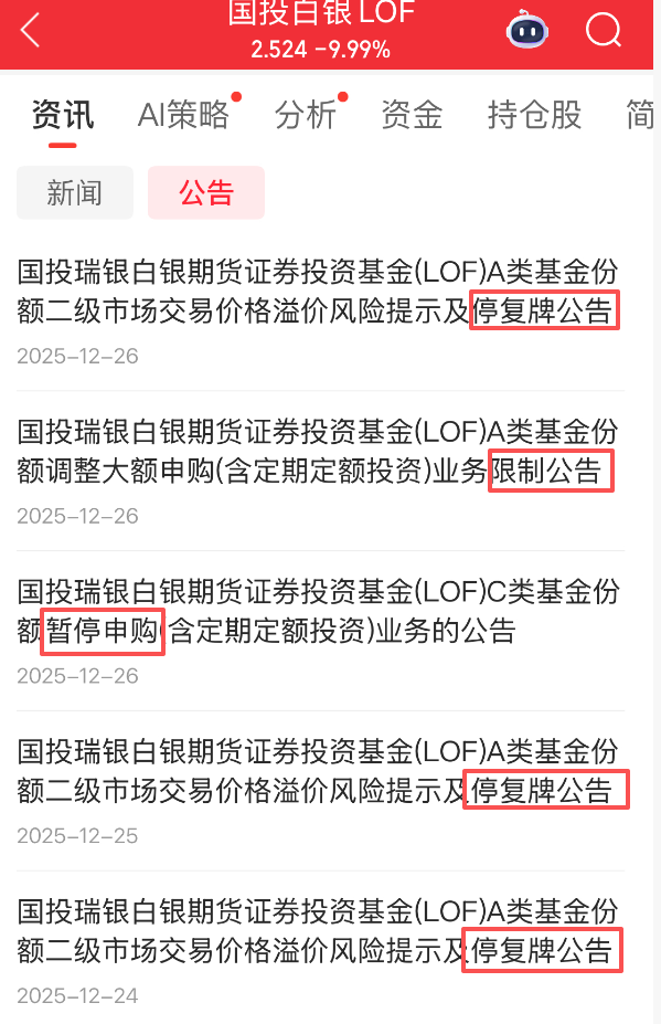 继12月24日发布停牌1小时公告之后,国投瑞银白银期货(LOF)昨天(12月25日)再度公告称,截至2025年12月25日,本基金二级市场的收盘价为2.804元,明显高于基金份额净值,投资者如果盲目投资于高溢价率的基金份额,可能面临较大损失。为保护投资者利益,本基金于2025年12月26日开市起至当日10:30停牌,自2025年12月26日10:30复牌。