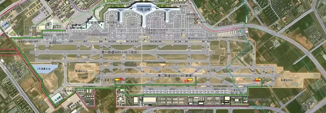 新建第二跑道(南跑道)是太原机场三期改扩建工程首个投运的大型项目,位于原跑道中心线南侧490米处,长3600米、宽45米,飞行区指标4E,可满足A340、B787等当前主流宽体客机的起降要求。