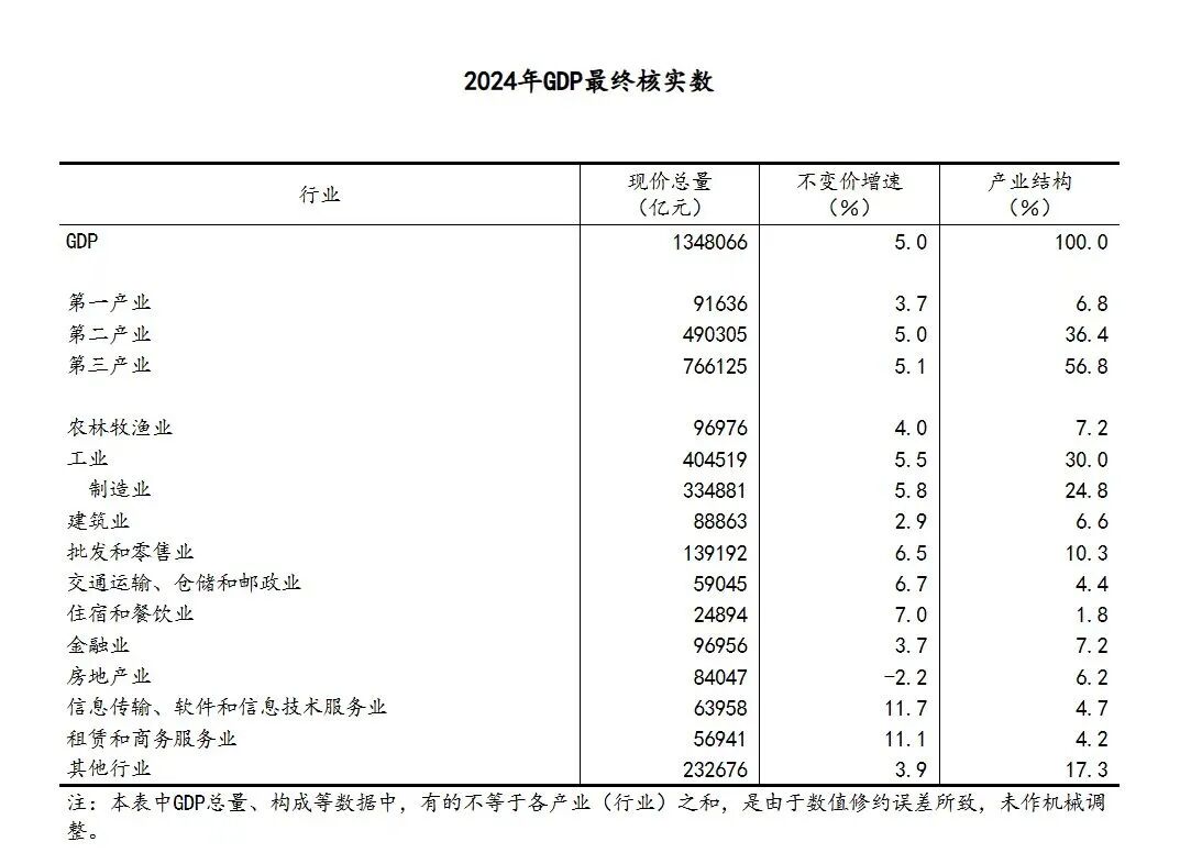 近日,根据国家统计局统计年报、财政部财政决算和有关部门年度财务资料等,国家统计局对2024年GDP数据进行了最终核实,主要结果如下:经最终核实,2024年,GDP现价总量为1348066亿元,比初步核算数减少1018亿元;按不变价格计算,比上年增长5.0%,与初步核算数持平。