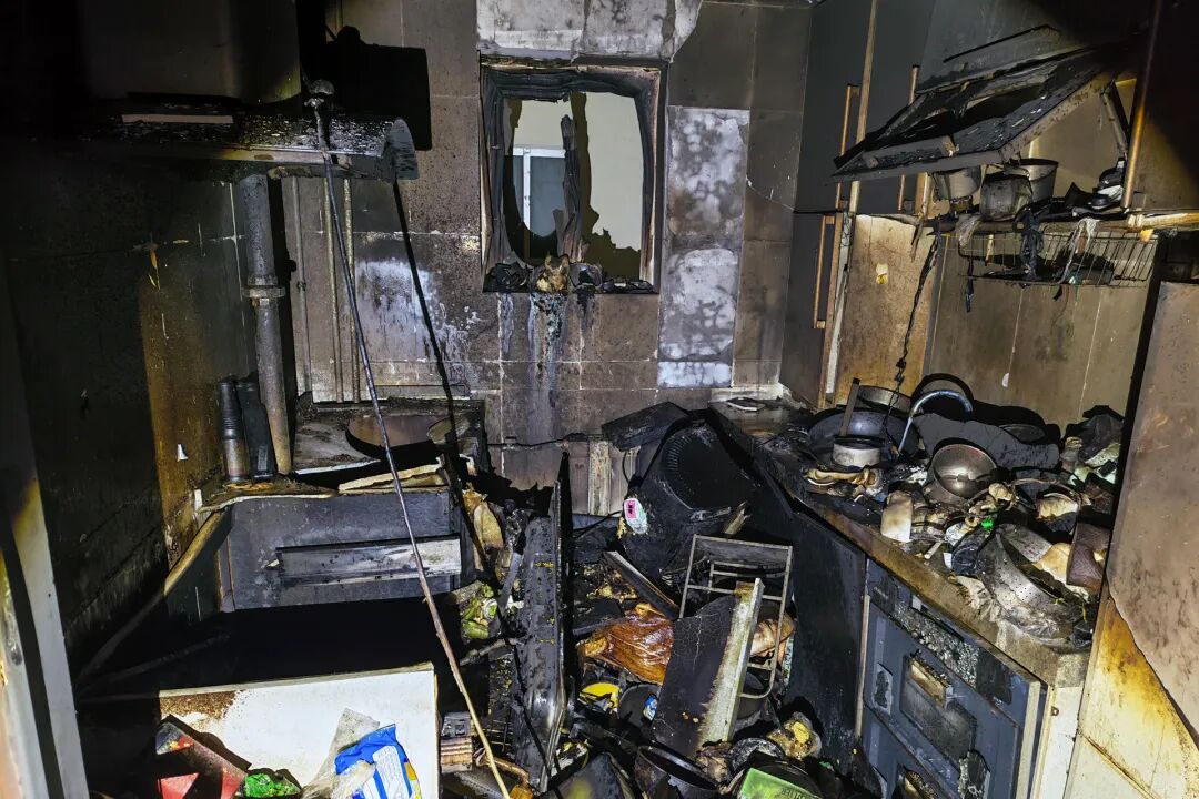 经勘验,火灾造成张大爷家厨房内的灶台、抽油烟机等物品烧损,墙面被熏黑,窗户玻璃也因高温碎裂,万幸未造成人员伤亡。