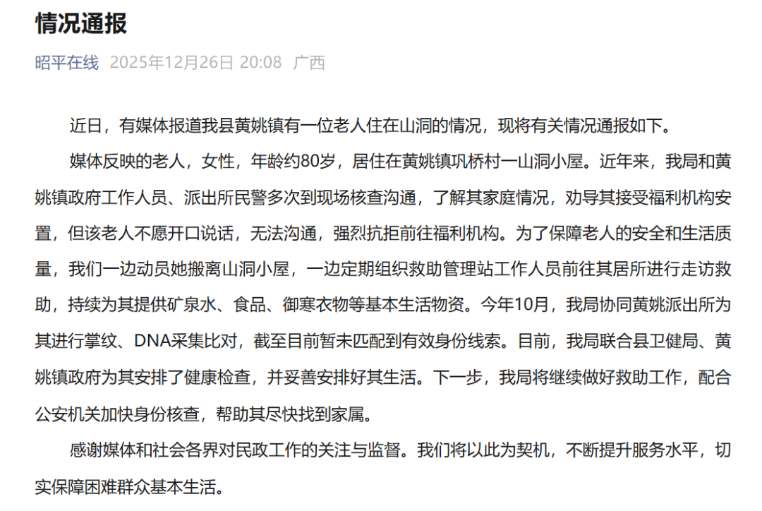 12月26日,广西昭平通报“80岁老人住在山洞里”,全文如下: