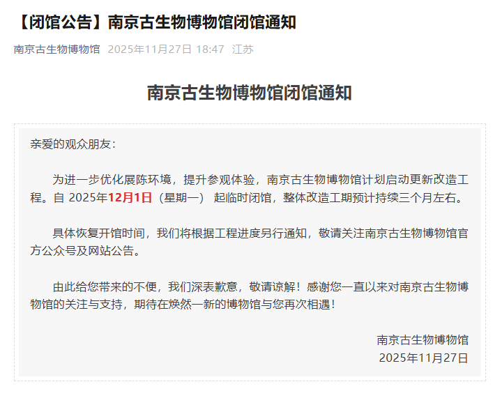 南京古生物博物馆计划启动更新改造工程,自 2025年12月1日(星期一) 起临时闭馆,整体改造工期预计持续三个月左右。
