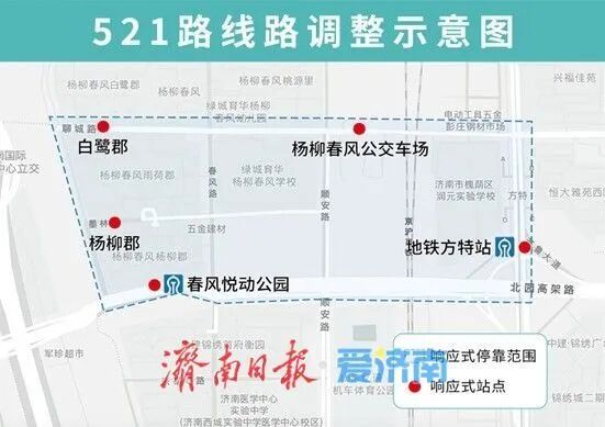 521路扩大响应区域,增设春风悦动公园(路北)站点,优化调整后与地铁1号线、4号线实现接驳。