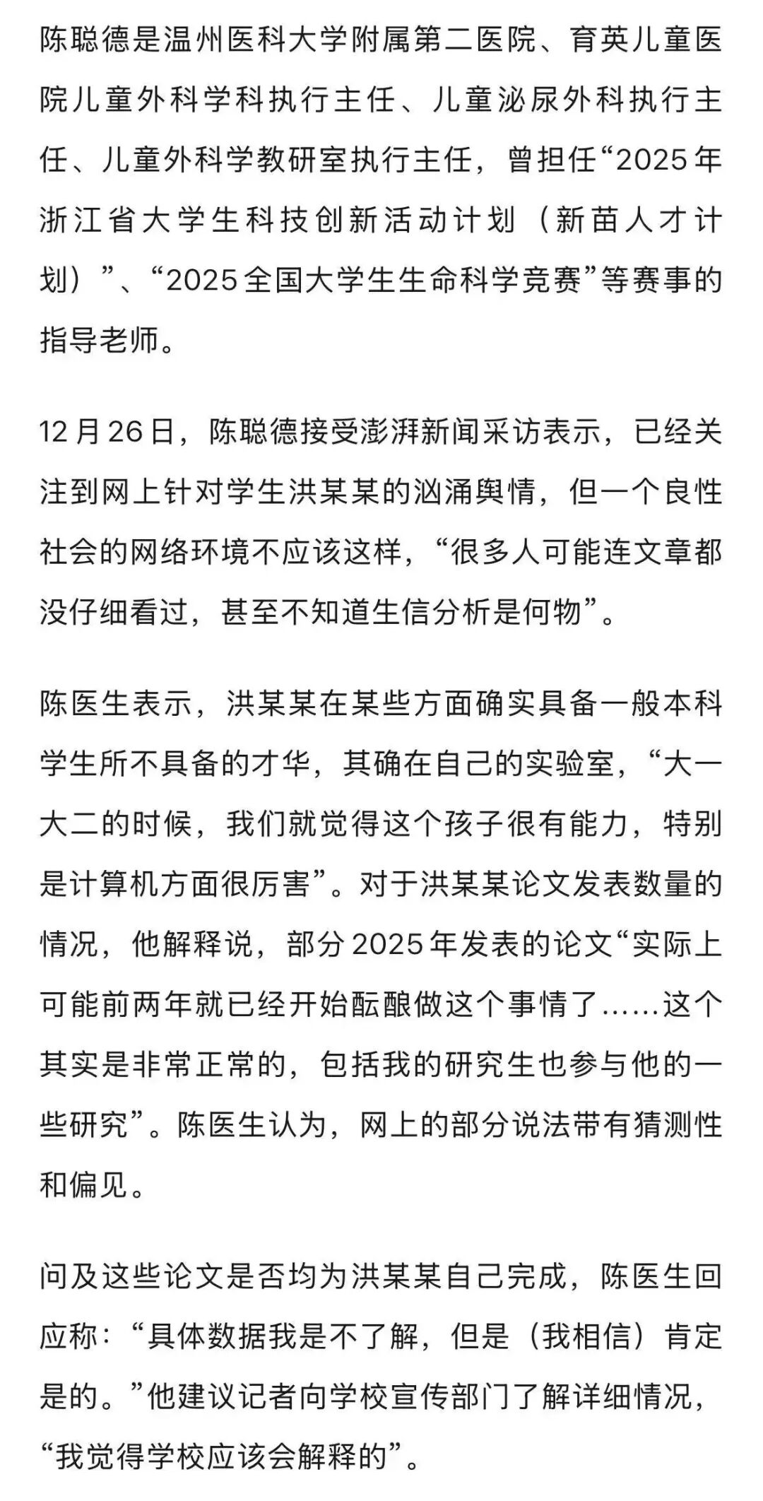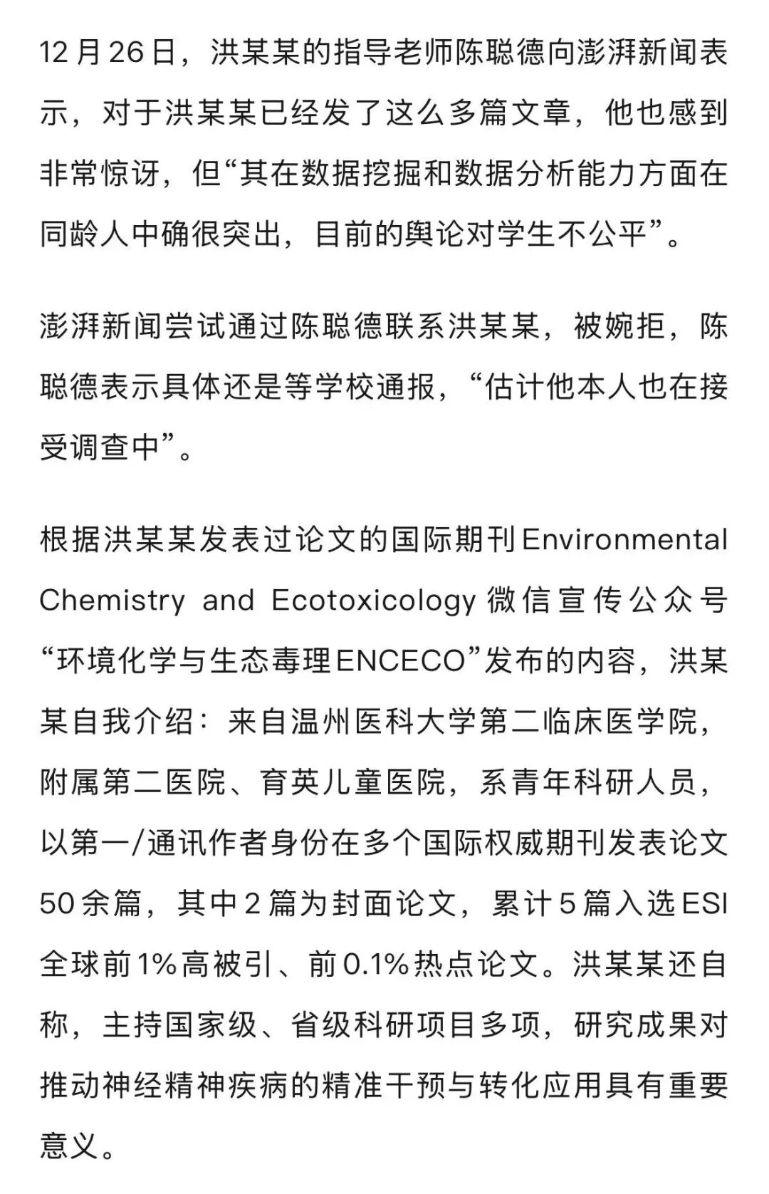 温州医科大学第二临床医学院大四学生洪某某因44篇论文被SCI期刊收录,近期引发关注。