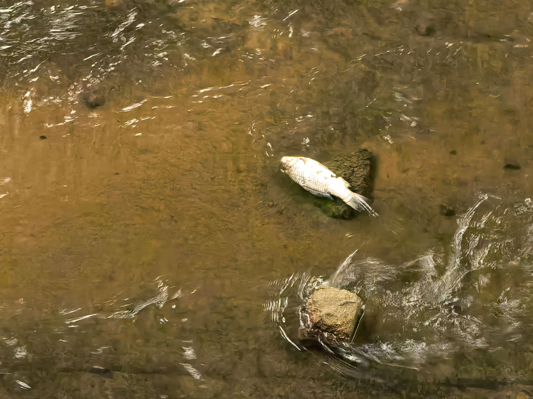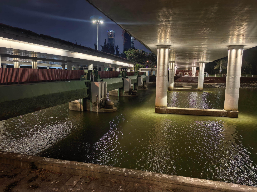 当晚,记者再次从茶光村临近河段出发,沿河道一路向南至大沙河入海口。此时河道水位较上午显著上涨,临近入海口的闸口处于开启状态。在上午发现死鱼的北环沙河西立交桥底,两条死鱼仍未清理,因受夜晚灯光昏暗影响,记者在其余河段未再发现新增死鱼,水面仅漂浮少量落叶等自然杂物,现场无死鱼腐烂产生的恶臭,仅能闻到河道正常的腥臭味。