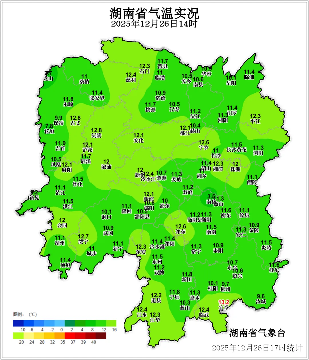 26日晚上至27日白天,晴天间多云;北风2~3级;最低气温湘南4~6℃,其他地区2~4℃;最高气温13~16<font face="仿宋_GB2312" style="-webkit-tap-highlight-color: rgba(0, 0, 0, 0);margin: 0px;padding: 0px;outline: 0px;max-width: 100%