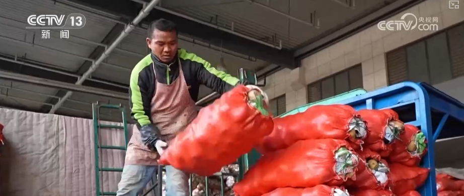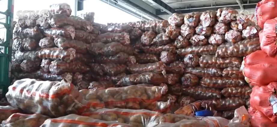 在农副产品物流中心蔬菜批发市场,大大小小的车辆往来穿梭,来自全国各地的新鲜蔬菜堆满货箱。在一家经营山东蔬菜的摊位前,一箱箱萝卜、土豆、洋葱等蔬菜摆放整齐。